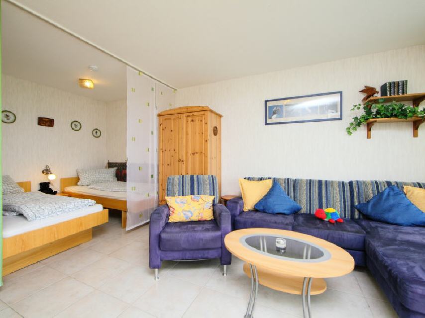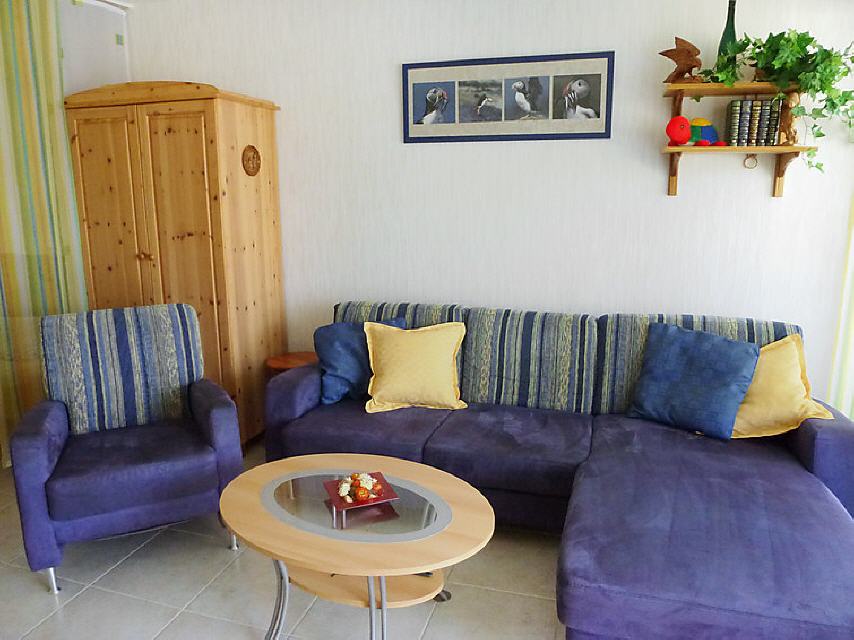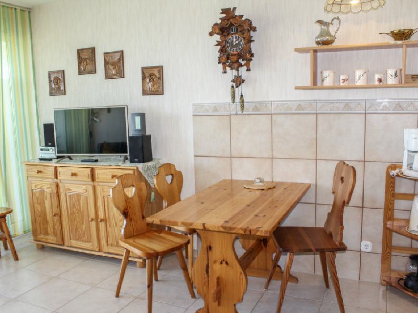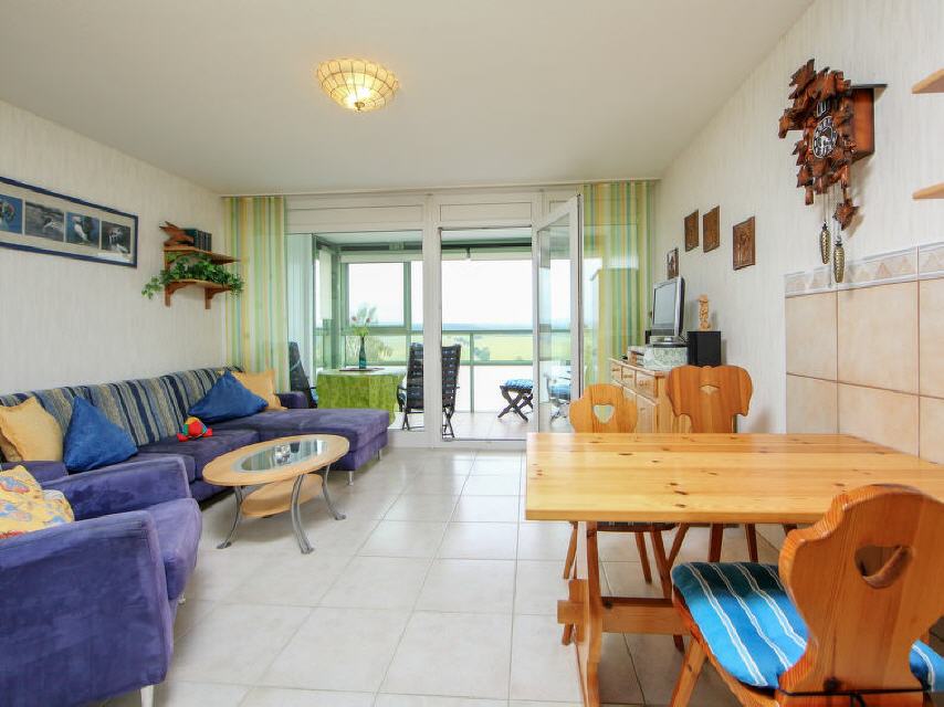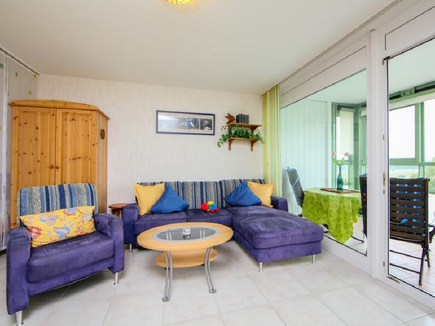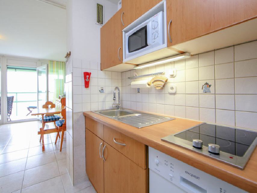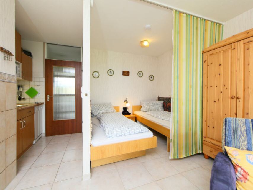 "B 102", 1-Zimmer-Wohnung 37 m2 im 3. Stock. Wohn-/Esszimmer mit 1 Diwanbett und Sat-TV (Flachbildschirm), Radio. Schlafnische mit Vorhang mit 2 Betten. Kochnische (2 Kochplatten, Mikrowelle, elektrische Kaffeemaschine). Dusche/WC. Balkon. Balkonmöbel. Zur Verfügung: Kinderhochstuhl (extra). Garage (extra). Bitte beachten: Nichtraucher-Unterkunft. Der Balkon ist verglast.