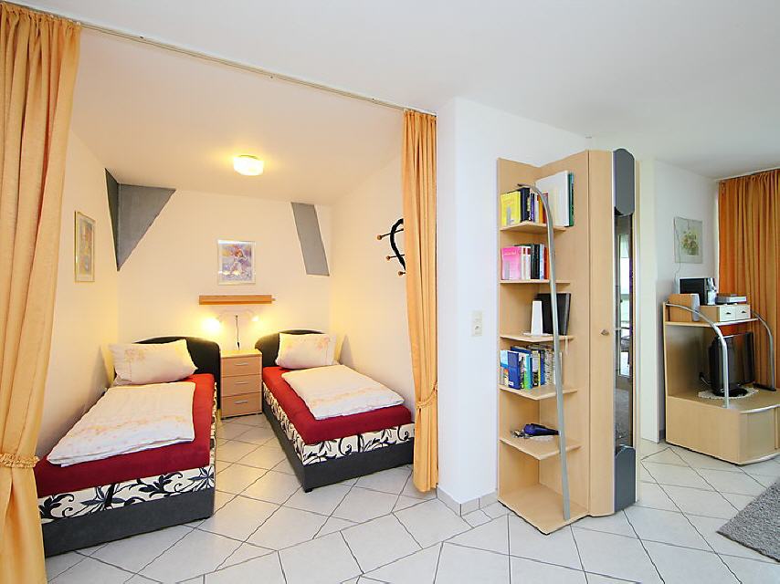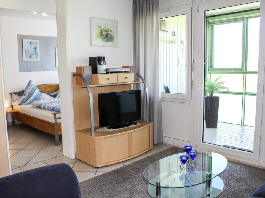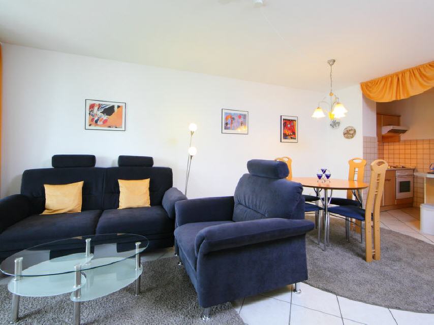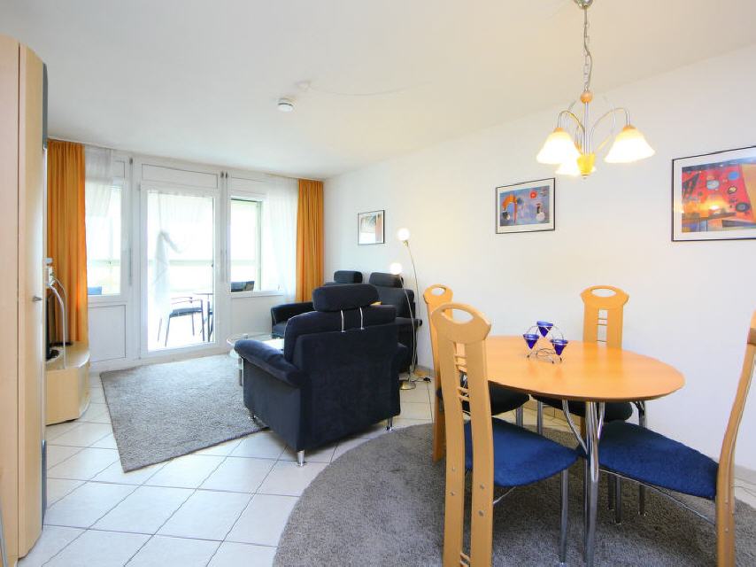"F 55", 2-Zimmer-Wohnung 54 m2 im 4. Stock. Wohn-/Esszimmer mit Sat-TV (Flachbildschirm), Radio, CD und DVD. Schlafnische mit Vorhang mit 2 Betten. 1 Doppelzimmer. Kochnische (4 Kochplatten, Backofen, Mikrowelle, elektrische Kaffeemaschine). Dusche/WC. Balkon. Balkonmöbel. Zur Verfügung: Telefon, Kinderhochstuhl, Haartrockner. Internet (DSL/LAN, gratis). Garage (extra). Bitte beachten: Nichtraucher-Unterkunft. Der Balkon ist verglast.