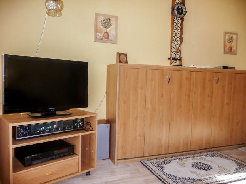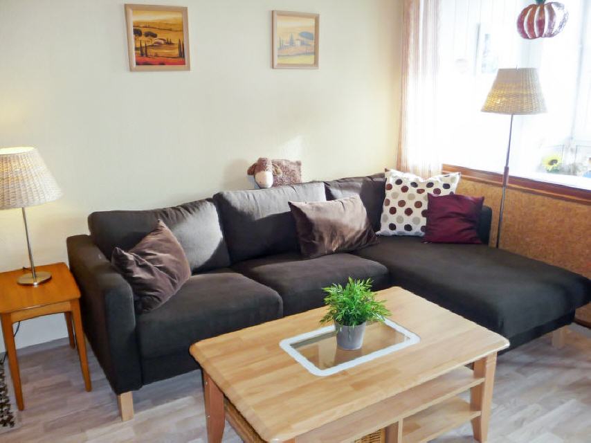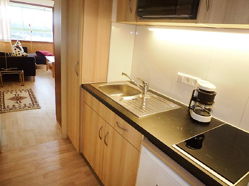 "G 103", 2-Zimmer-Wohnung 51 m2 im 3. Stock. Wohn-/Esszimmer mit 1 Wandschrankbett und Sat-TV (Flachbildschirm), CD. 1 Zimmer mit 2 Betten und Waschbecken. Kochnische (2 Kochplatten, Mikrowelle, elektrische Kaffeemaschine). Dusche/WC. Balkon. Balkonmöbel. Zur Verfügung: Kinderhochstuhl (extra). Bitte beachten: Nichtraucher-Unterkunft. Maximal 2 Haustiere/Hunde erlaubt. Die Betten im Zweibettzimmer stehen hintereinander. Der Balkon ist verglast.