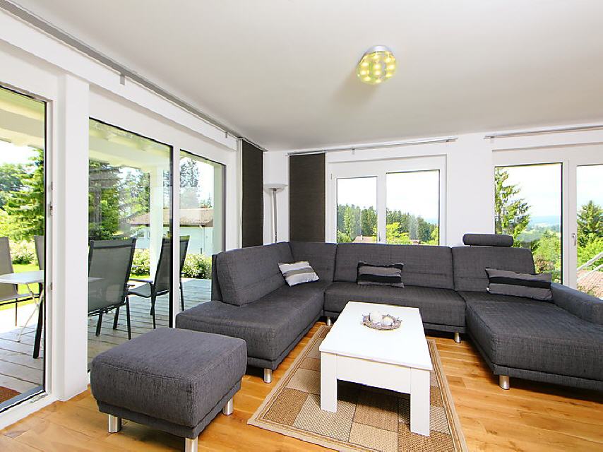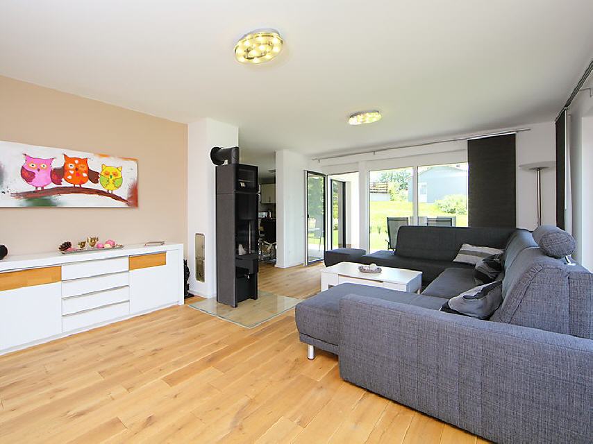 4-Zimmer-Haus 110 m2 auf 2 Stockwerken, im Erdgeschoss. Sehr schön und geschmackvoll eingerichtet: grosses Wohn-/Esszimmer mit Panoramafenster mit Schwedenofen und Sat-TV (Flachbildschirm), Radio, CD und DVD. Ausgang zur Terrasse. 1 Doppelzimmer. 1 Zimmer mit 2 Betten. Offene Küche (Backofen, Geschirrspüler, 4 Glaskeramikherd Platten, Mikrowelle, elektrische Kaffeemaschine). Sep. WC, Bad/Dusche/WC. Unteres Geschoss: (Aussentreppe) 1 Doppelzimmer mit Sat-TV (Flachbildschirm), Radio und CD. Dusche/WC. Grosse Terrasse 20 m2. Terrassenmöbel, Elektrogrill (mobil). Schöne Fernsicht auf die Landschaft. Zur Verfügung: Waschmaschine, Wäschetrockner, Telefon, Bügeleisen, Kinderhochstuhl (extra), Haartrockner, Holz (extra). Internet (Wireless LAN, gratis). Garage (2 Autos). Bitte beachten: Nichtraucher-Haus. Das Untergeschoss ist nur über einen separaten Ausseneingang erreichbar.