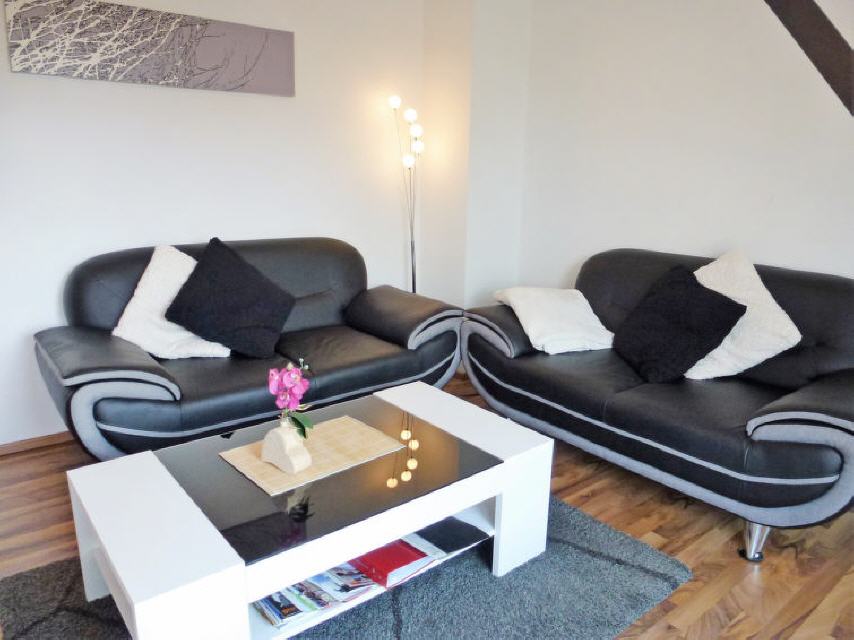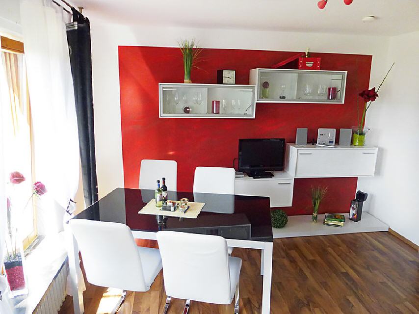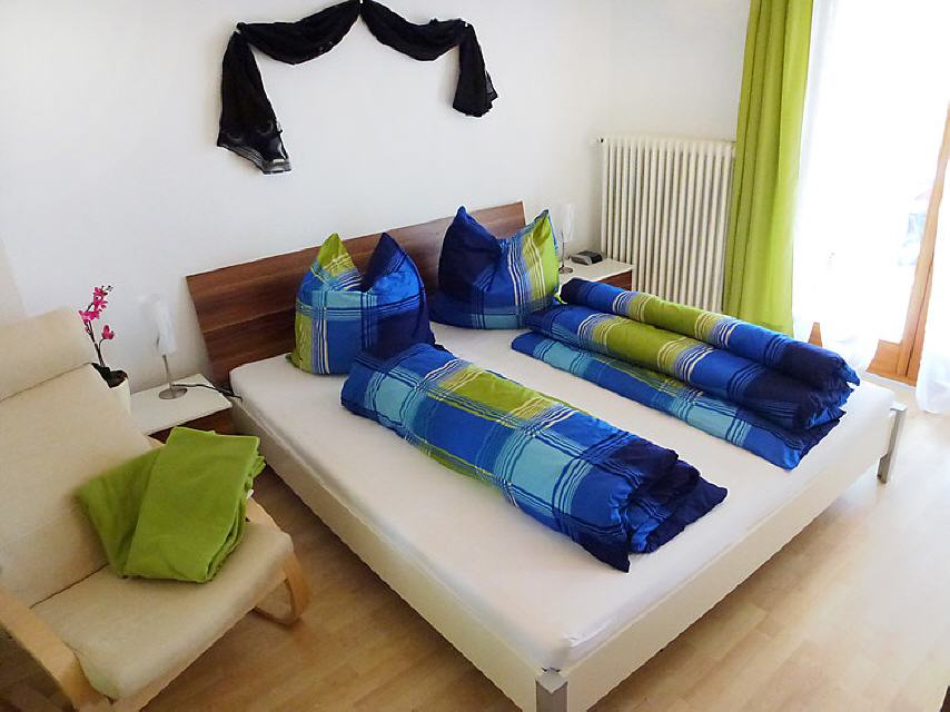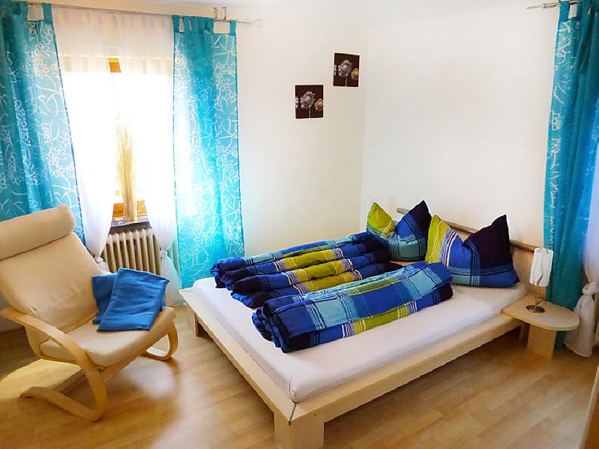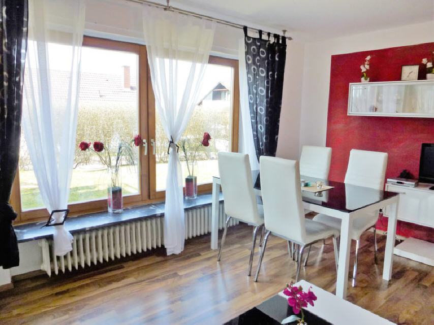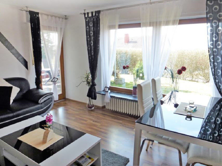 3-Zimmer-Einliegerwohnung 83 m2, unteres Geschoss. Modern eingerichtet: Wohn-/Esszimmer mit Sat-TV (Flachbildschirm), CD und Stereoanlage. Ausgang zur Terrasse. 1 Zimmer mit 1 franz. Bett (140 cm, Länge 200 cm). 1 Doppelzimmer. Ausgang zum Garten, zur Terrasse. Küche (Backofen, Geschirrspüler, 4 Glaskeramikherd Platten, Mikrowelle, elektrische Kaffeemaschine) mit kleinem Esstisch. Bad/Dusche, sep. WC. Terrassenmöbel, Gartengrill (mobil), Abstellkammer. Zur Verfügung: Waschmaschine, Kinderhochstuhl. Bitte beachten: Nichtraucher-Unterkunft. Eigener Eingang, Rauchmelder, Feuerlöscher.