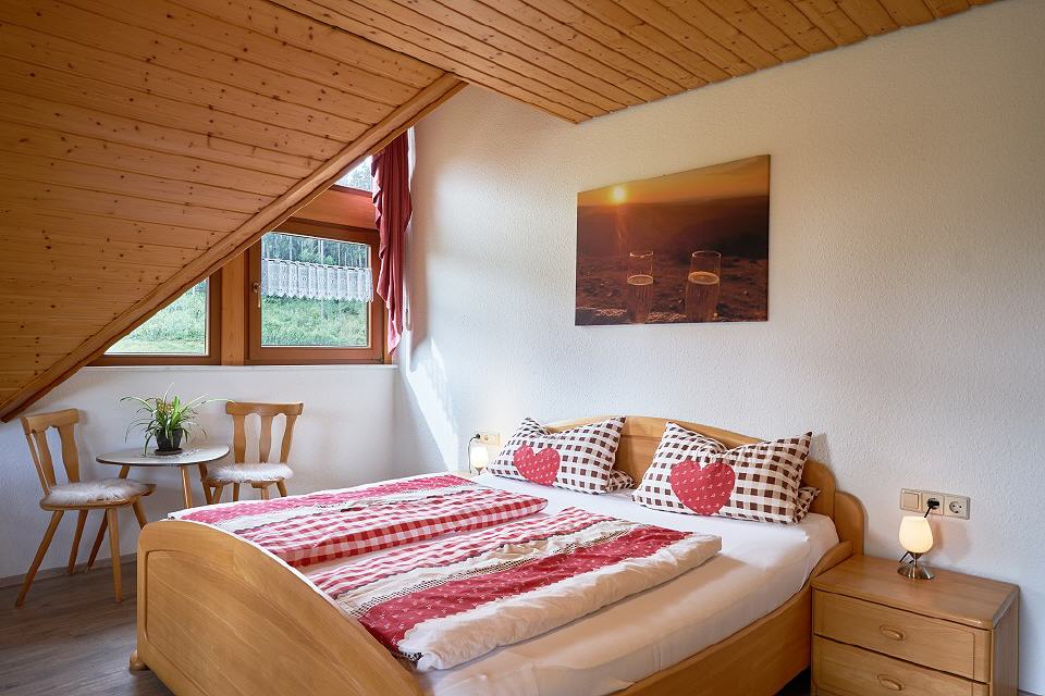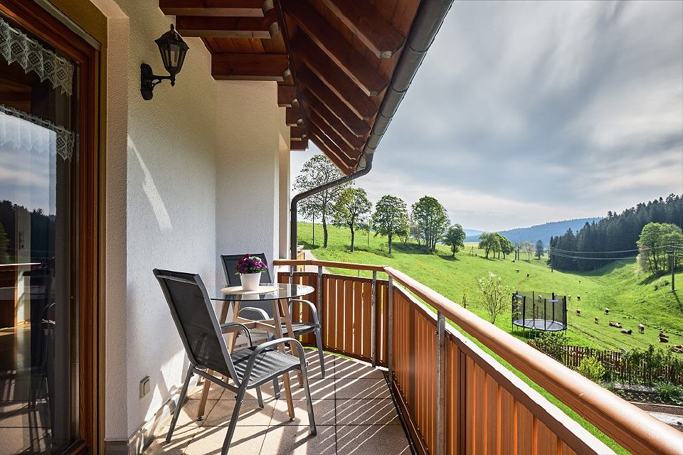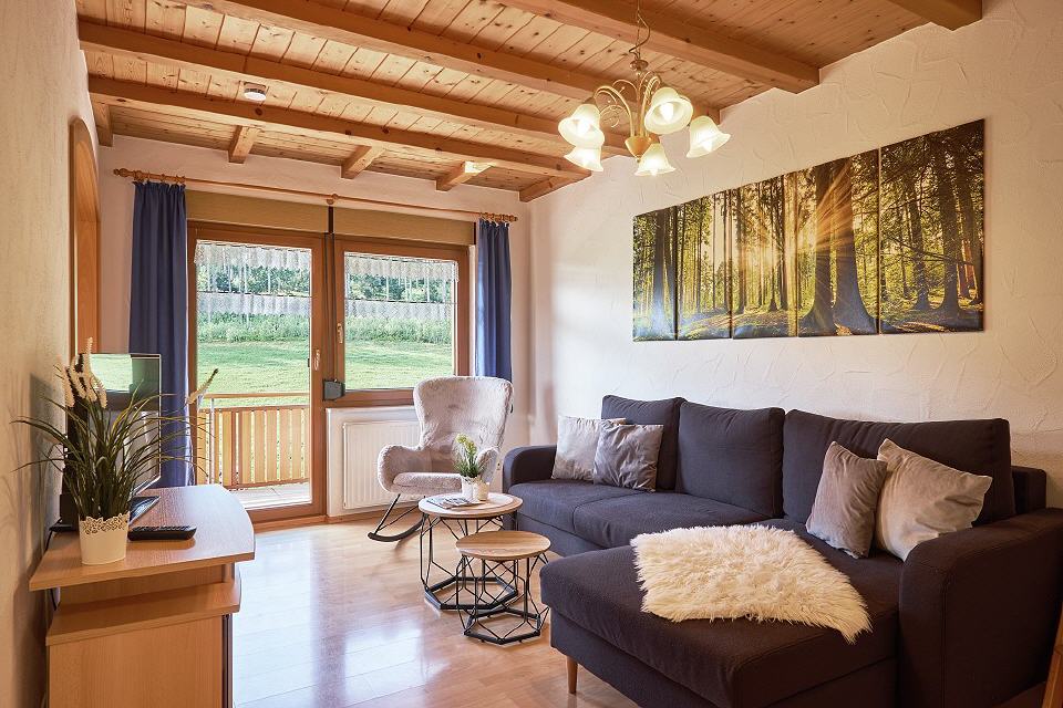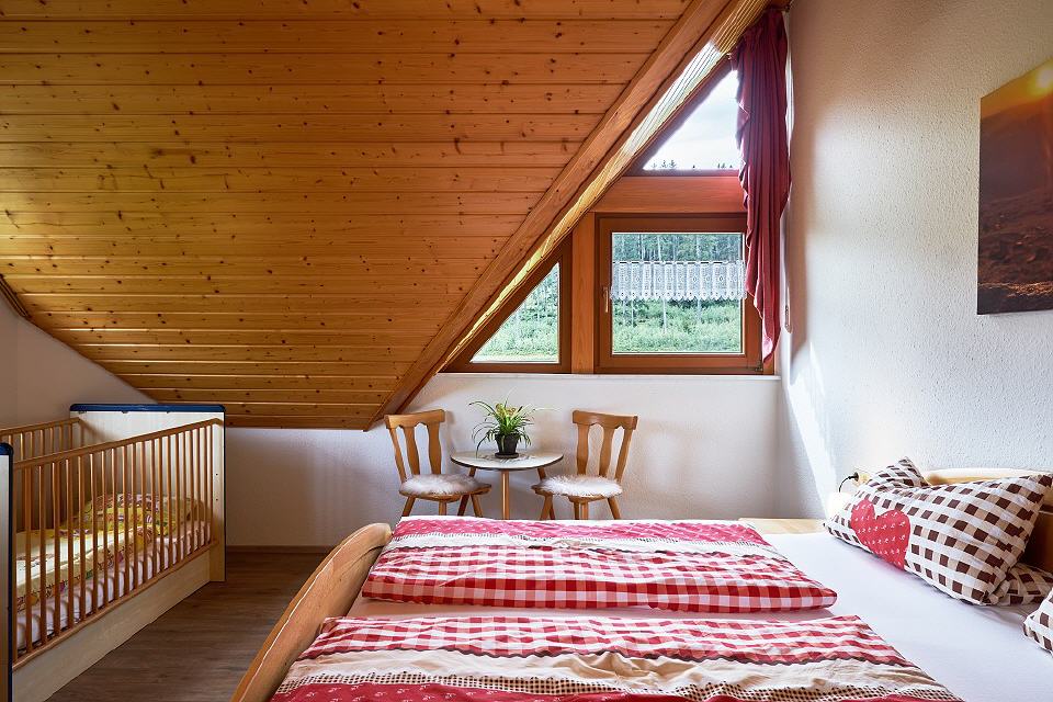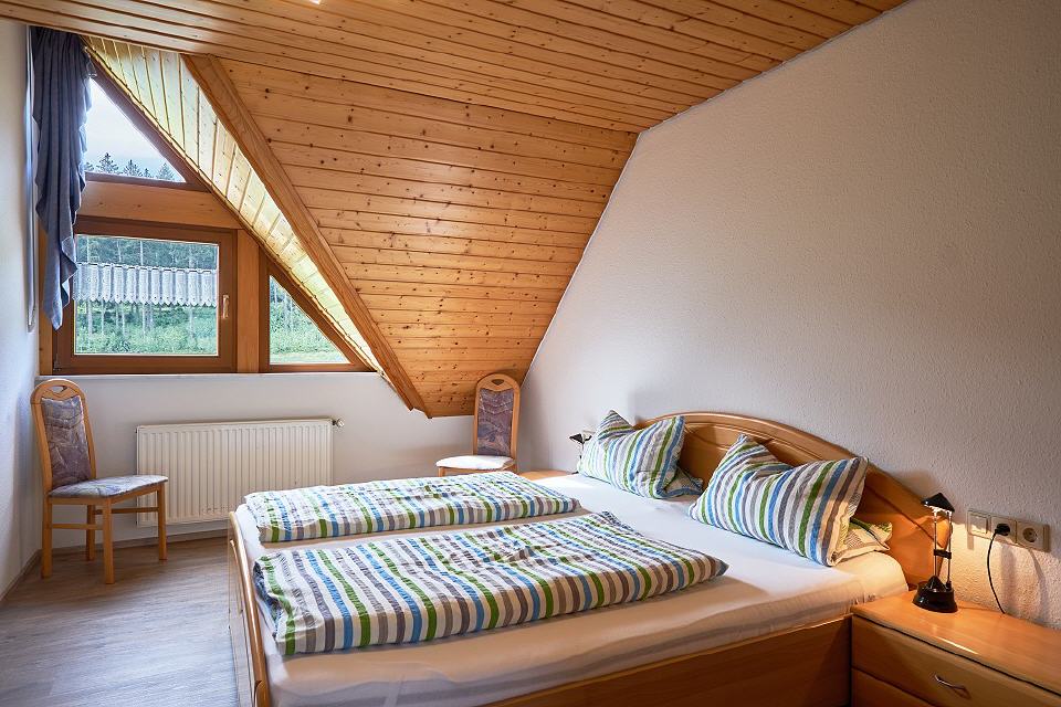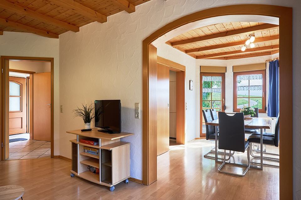 Die Ferienwohnungen ist im neu erbauten Gästehaus untergebracht. Sie verfügt über vier Zimmer, bietet mit ihren 70 qm Wohnflächen genügend Platz für Familien mit Kindern und liegt auf zwei Etagen. Die Ferienwohnung hat einen eigenen Eingang. Sie liegt in Südlage, wohin auch der Balkon ausgerichtet ist. Sowohl auf der unteren als auch oberen Etagen finden Sie ein WC vor.