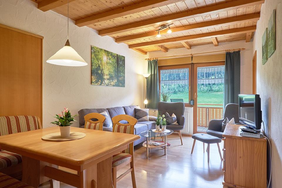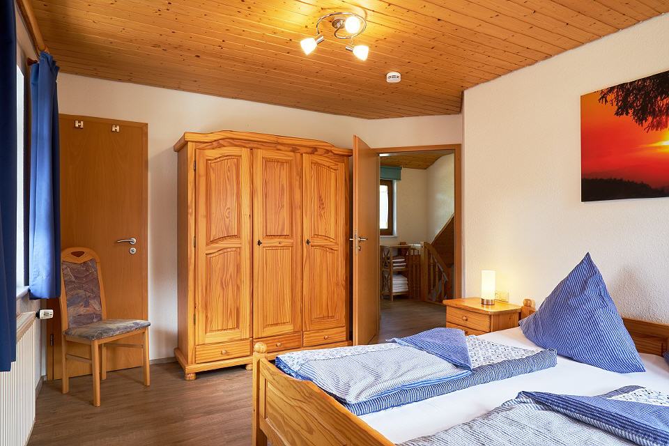 Die Ferienwohnungen ist im neu erbauten Gästehaus untergebracht. Sie verfügt über vier Zimmer, bietet mit ihren 70 qm Wohnflächen genügend Platz für Familien mit Kindern und liegt auf zwei Etagen. Die Ferienwohnung hat einen eigenen Eingang. Sie liegt in Südlage, wohin auch der Balkon ausgerichtet ist. Sowohl auf der unteren als auch oberen Etagen finden Sie ein WC vor.